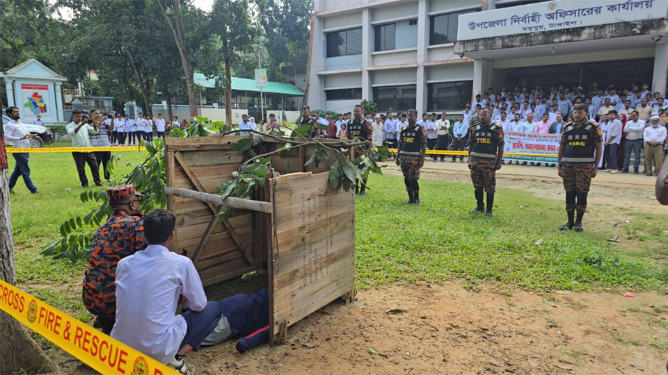 টাঙ্গাইলের মধুপুরে দুর্যোগ প্রশমন দিবস উপলক্ষে উপজেলা প্রশাসন ও দুর্যোগ ব্যবস্থাপনা বিভাগের উদ্যোগে র্যালি, আলোচনা সভা ও মহড়া অনুষ্ঠিত হয়েছে।