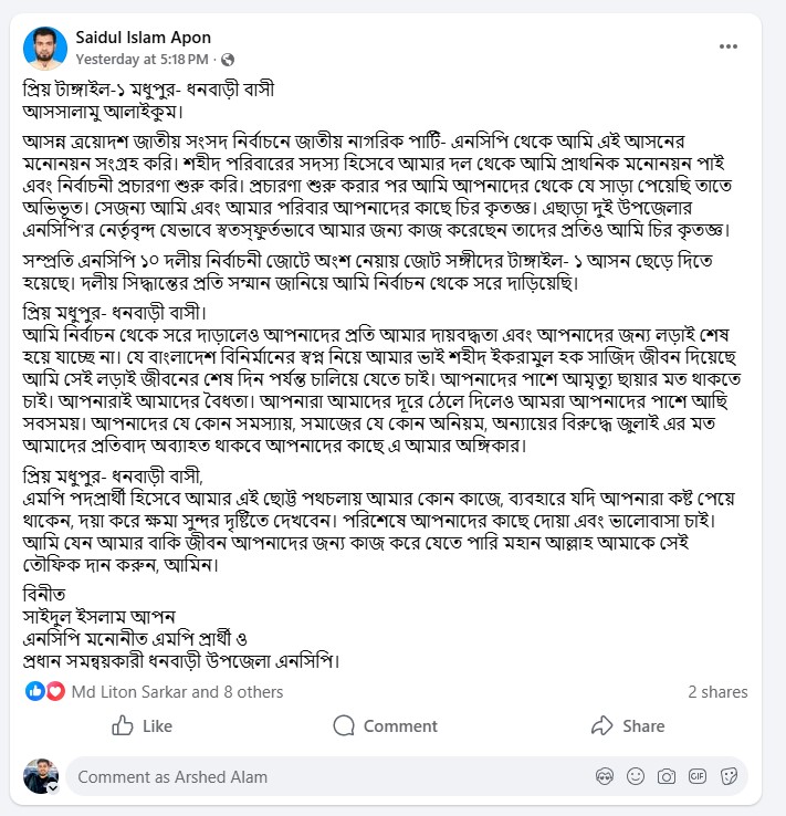তিনি আরও জানান, সম্প্রতি এনসিপি ১০ দলীয় নির্বাচনী জোটে অংশ নেওয়ায় জোটগত সিদ্ধান্ত অনুযায়ী টাঙ্গাইল-১ আসনটি ছেড়ে দিতে হয়েছে। দলীয় সিদ্ধান্তের প্রতি পূর্ণ সম্মান জানিয়ে তিনি নির্বাচন থেকে সরে দাঁড়ানোর সিদ্ধান্ত গ্রহণ করেছেন।